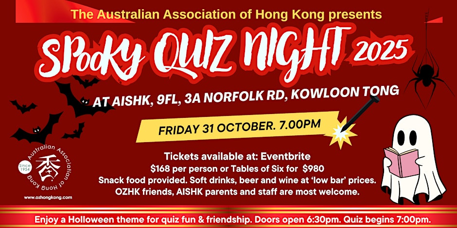 Join the Australian Association of Hong Kong for a spooky quiz night on Halloween, Friday 31 October 2025! Enjoy a quiz fun and friendship!