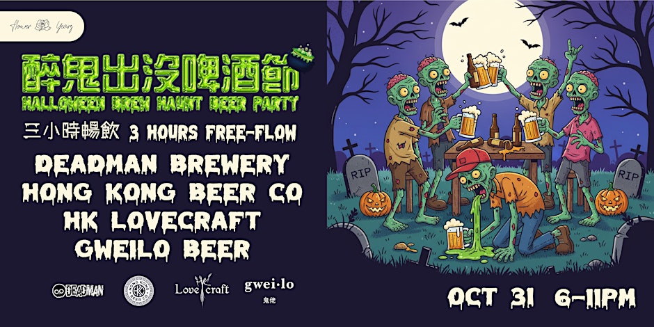 Your ticket grants you three haunted hours of free-flow craft beer from Hong Kong’s finest craft breweries—with Deadman, HK Beer Co., Lovecraft, and Gweilo—alongside frightfully good beer snacks like crispy chicken nuggets with a neon green coriander sauce or devilish hot sauce, garlic bread and “goth” squid ink-glazed squid bites. The evening will pulse with live busking, DJs spinning your favorite Cantopop tunes, and classic drinking games like darts, cornhole, and our legendary beer can tower challenge.